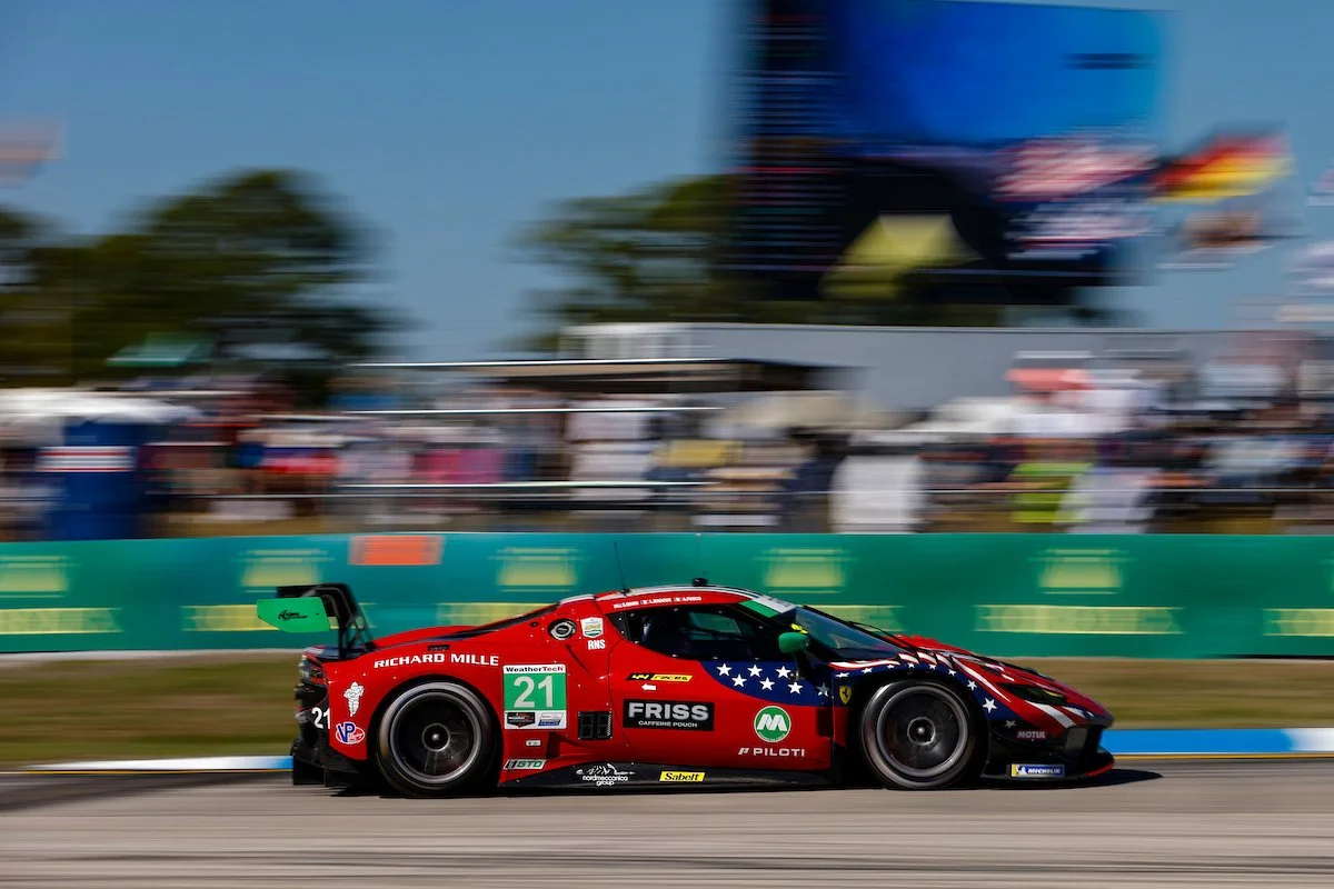 It came down to the final lap in Grand Touring Daytona (GTD) when the No. 27 Aston Martin Vantage GT3 Evo, driven by Tom Gamble, slid wide entering turn 10, allowing the No. 21 Ferrari 296 GT3 Evo of Antonio Fuoco to slip inside and take the win, despite being penalized three times during the race, including in the last frantic hour.